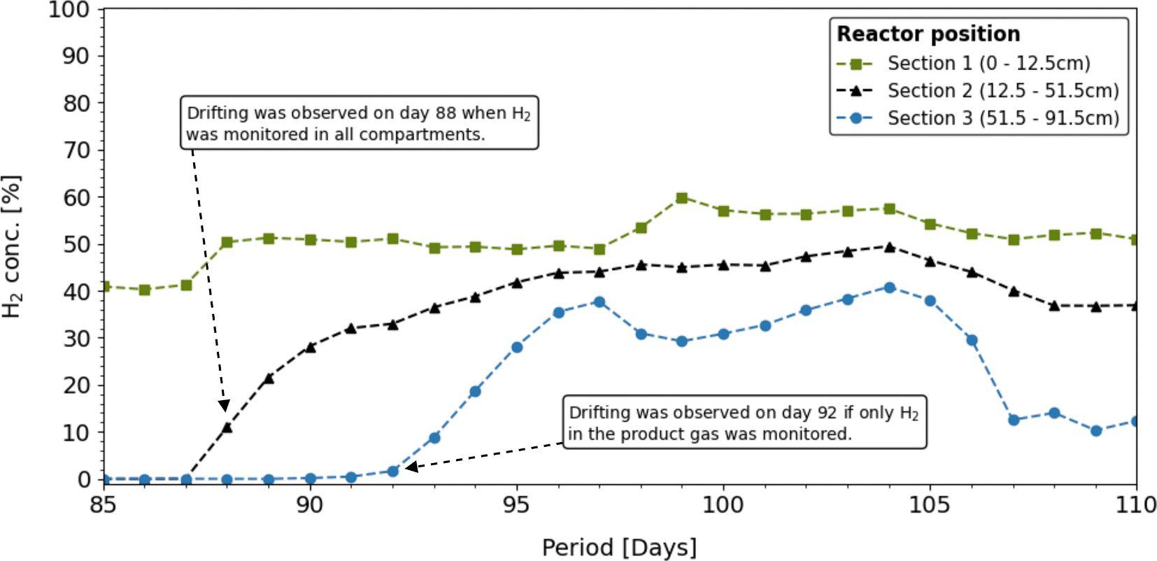 圖4、滴流床反應器第88天通過氫氣微傳感器揭示的酸化早期預警,隨后在第92天完全酸化,導致產品氣質量下降。每個數據點代表1440次測量的平均值(每分鐘1次測量)。
