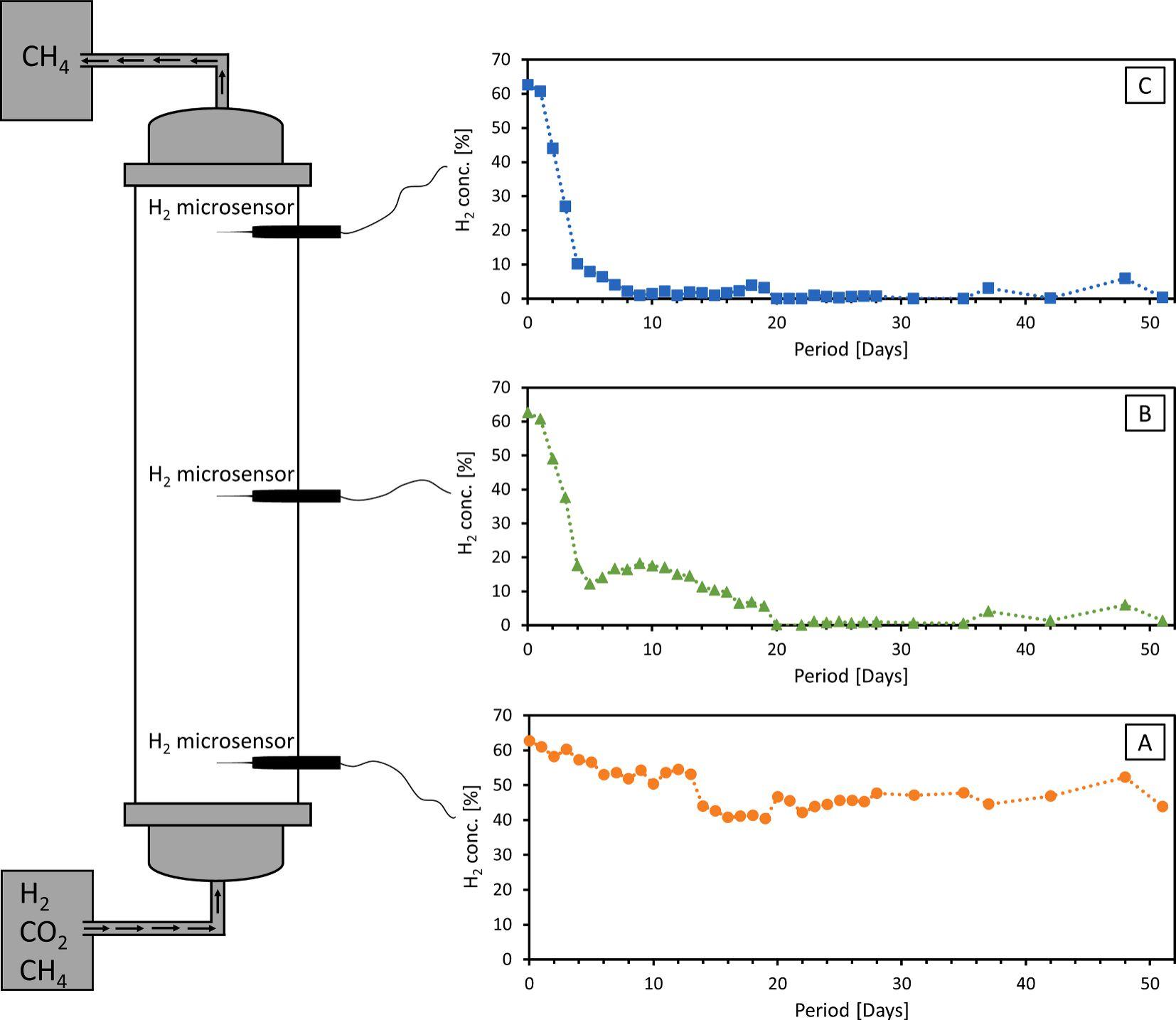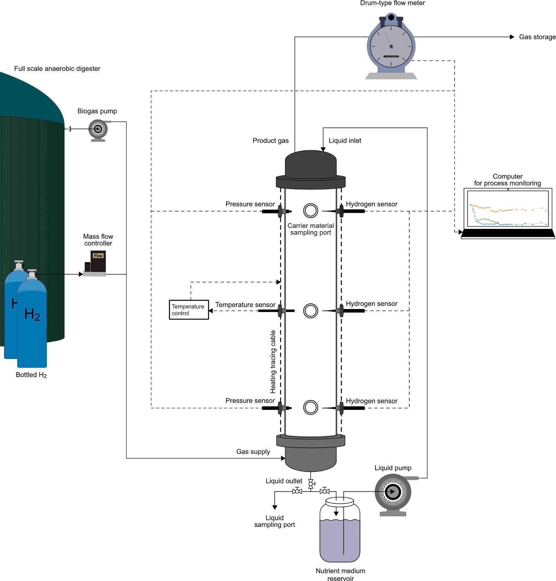 本研究采用一種新穎的方法,通過在滴流床反應器(TBR)的垂直軸上安裝多個H2微傳感器,監測反應器內部的動態過程。該方法在丹麥的一家全規模沼氣廠中進行了135天的實驗驗證。研究人員通過在TBR的不同高度安裝氫氣微傳感器(unisense),以創建反應器內的H2濃度剖面。通過持續監測H2濃度,實現對TBR內部動態的實時監測和控制,最大限度地利用反應器的性能能力,并且能夠在反應器性能惡化之前幾天發出早期預警。