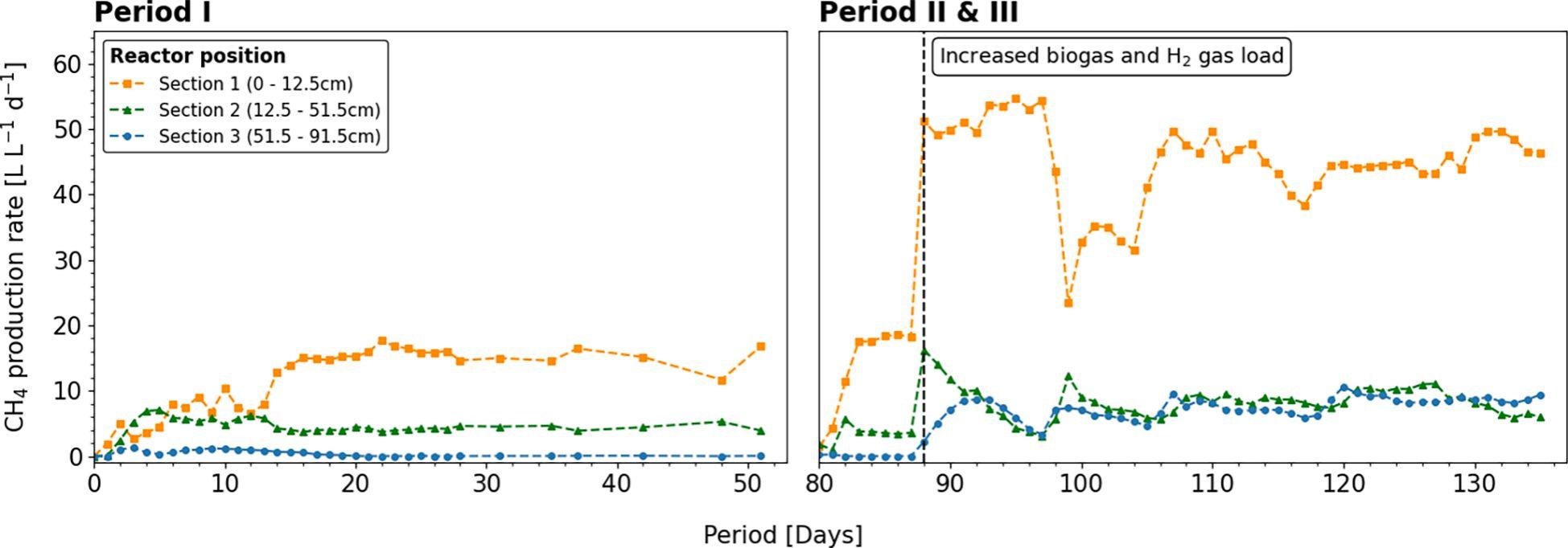 圖3、135天操作期間,在滴流床反應器垂直軸線上不同位置的傳感器測量的局部甲烷生產能力時間序列數據(基于連續的氫氣傳感器和定期的氣體成分及流量測量):第1段(0–12.5厘米),第2段(12.5–51.5厘米),第3段(51.5–91.5厘米)。每個數據點代表1440次測量的平均值(每分鐘1次測量)。