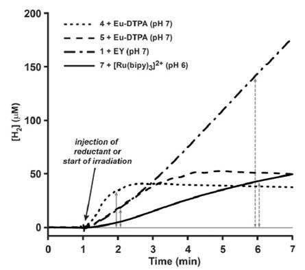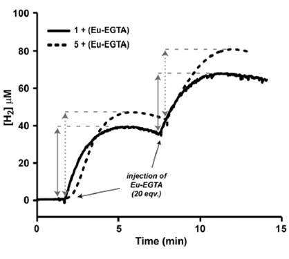 圖3、光催化分解水產氫體系中加入1ml濃度為10um光催化劑1(黑色實線)和5后(虛線),體系中氫氣濃度的變化情況分析,其中曲線的拐點處表示的是體系中注入了20eq的光敏劑Eu-EGTA后,體系中氫氣濃度隨時間變化的情況。從圖中的曲線趨勢可以看出,當體系中加入光敏劑和電子給體后,光催化劑催化體系中的質子還原產生氫氣的速率加快。