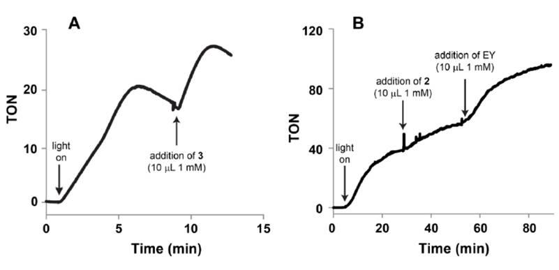圖4、催化劑對于光催化分解水體系產氫的催化循環(huán)數的影響。圖A表示的是光催化分解水產氫體系中先進行光照后,然后加入10ul濃度為1mM的催化劑3,體系中的產氫的總轉移率。圖B表示了光催化分解水產氫體系中先光照,然后加入10ul濃度為1mM的催化劑2后,繼續(xù)加入催化劑EY后體系中的氫氣催化循環(huán)數隨時間變化情況。