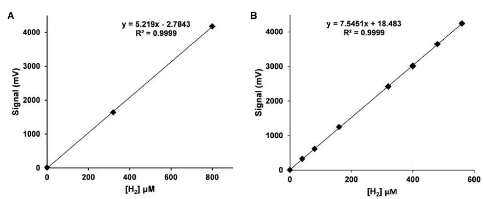 圖5、圖A表示的是unisense氫氣微電極采用三點校正法(氫氣濃度分布為0、320μM、800μM)獲得的標準曲線。圖B表示的是應用了8中不同濃度的氫氣((0,40,80,160,320,400,480,and 560μM))水溶液進行校正獲得的標準曲線。從圖中可以看出這兩條標準曲線的線性非常好,其線性相關R值為0.9999。當體系中的溶液體系有所改變時,相應的校正曲線需要再次校正。水溶液中不同濃度的氫氣是通過混合不同比例的氫氣和氮氣實現的(0:100 H2/N2(0μM),5:95 H2/N2(40μM),10:90 H2/N2(80μM),20:80 H2/N2(160μM),40:60 H2/N2(320μM),50:50 H2/N2(400μM),60:40 H2/N2(480μM),70:30 H2/N2(560μM)。