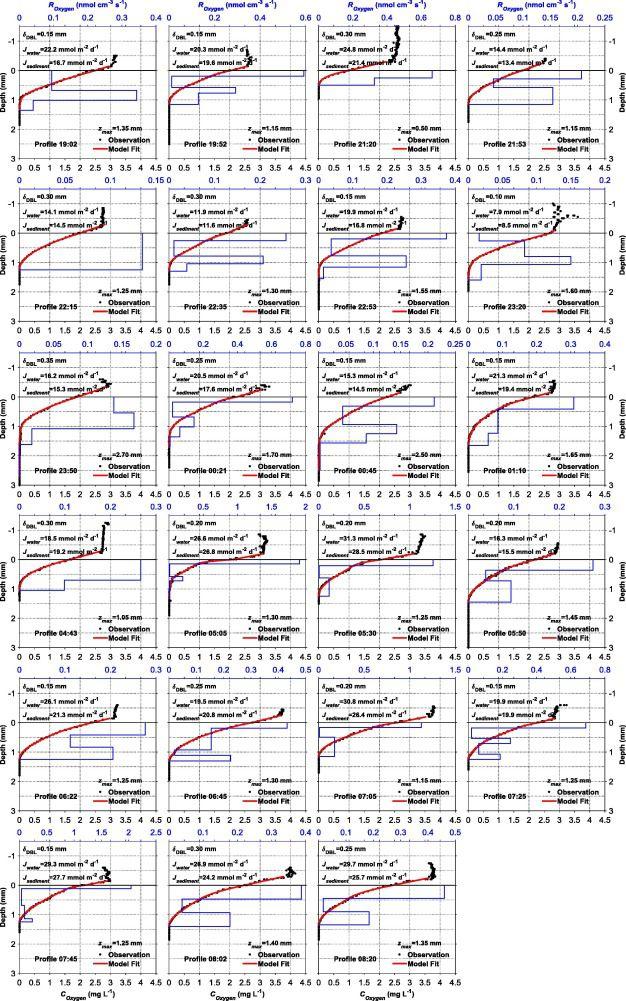 圖2、顯示了長江口總共23個觀測到的氧氣剖面和相應(yīng)的模型?;谟^測(黑圈)、模型擬合(紅線)和模型耗氧率Roxygen)剖面圖(藍色階梯線)從圖中可以看出三個地點的氧氣剖面垂直分布遵循相似的模式。BBL中的氧濃度幾乎一致,DBL中的氧濃度向SWI線性下降。上部沉積物區(qū)域的濃度斜率小于DBL中的濃度斜率,反映出上部沉積物中的擴散系數(shù)小于水中的擴散系數(shù)。對于所有三個地點,PROFILE模型都很好地模擬了DBL和r2高于0.99的沉積物中觀測到的氧氣分布。對于每個剖面,沉積物中氧濃度的深度積分時間變化小于深度積分耗氧量的4%,表明處于準(zhǔn)穩(wěn)態(tài)條件。