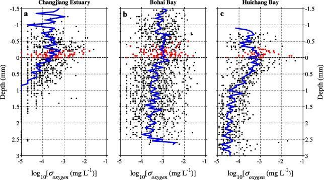 圖4、顯示了三個近岸海域氧濃度標(biāo)準(zhǔn)差(σoxygen)的垂直分布。(a)長江口、(b)渤海灣、(c)會昌灣氧濃度標(biāo)準(zhǔn)差(σoxygen)的垂直分布。黑色實心圓圈表示觀測值,藍線表示相同深度的中值。DBL中的σoxygen值用紅色表示。在所有三個站點中,BBL中的σoxygen平均小于DBL中的σoxygen。在BBL中,強烈的湍流使氧濃度混合至接近均勻;而在DBL中,湍流渦流擴散被抑制,分子擴散成為氧傳輸?shù)目刂七^程。從SWI到沉積物,三個站點的σoxygen均有所下降,特別是在長江口和會昌灣,沉積物中的σoxygen平均小于1個數(shù)量級。在DBL中,這部分是由于氧濃度下降,但主要是由于DBL中擴散傳輸?shù)挠绊懼饾u減弱所致。