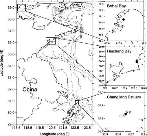 圖1、研究區(qū)域地圖,其中長江口、渤海灣和會昌灣使用放大面板(右側(cè))突出顯示,測量位置用實心圓圈表示。等深線(虛線)表示以米為單位的等值線。