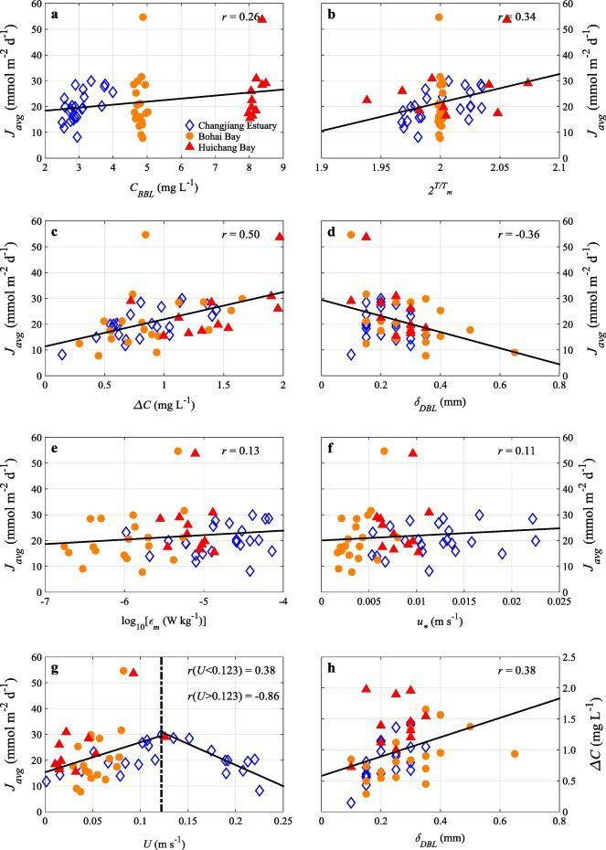圖5、擴散通量(J avg)與以下各項的散點圖:(a)BBL中的氧濃度(C BBL),(b)標(biāo)準(zhǔn)化底棲溫度(2T/Tm),(c)DBL上的氧濃度差(ΔC),(d)DBL厚度(δDBL),(e)湍流動能耗散率(εm),(f)摩擦速度(u?),(g)流速(U)。(h)ΔC與δDBL的散點圖。在每個圖中,直線描繪了通過最小二乘擬合獲得的線性回歸,并顯示了回歸擬合的相關(guān)系數(shù)(r)。面板(g)中的垂直線可作為區(qū)分U的大值和小值的指導(dǎo)。