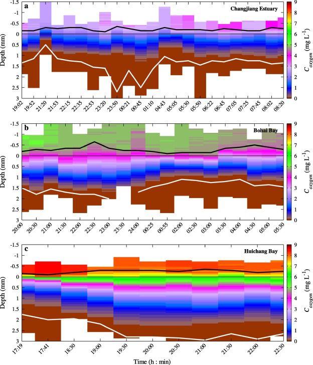 圖3、三個地點中每個地點的SWI(沉積物-水界面)附近氧濃度的時間深度變化,黑線和白線分別表示δDBL和zmax。(a)長江口、(b)渤海灣、(c)會昌灣底部沉積物-水界面內(nèi)氧濃度(Coxygen)隨深度變化。黑線和白線分別表示DBL厚度和穿透深度。