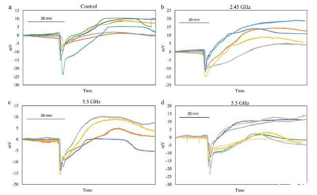 圖4、火焰傷害引發了木立蘆薈葉子的電位。板“a”是沒有微波暴露的傷口感應電勢的對照實驗,板b、c和d分別是2.45 GHz、3.5 GHz和5.5 GHz微波暴露下的傷口感應電勢。