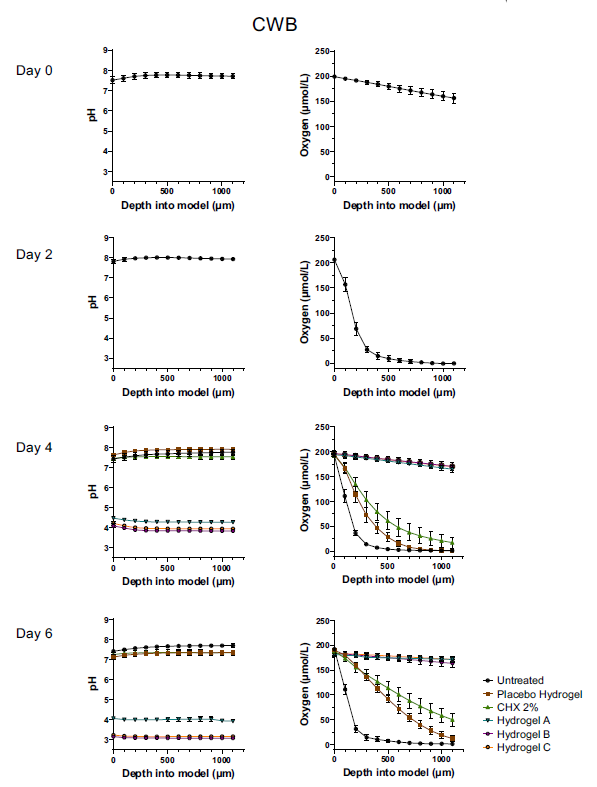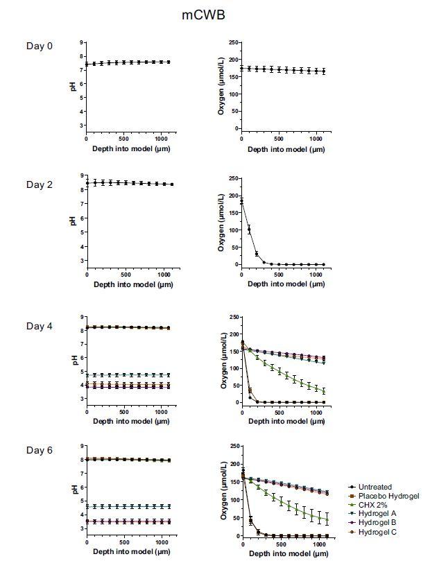 圖3、CWB模型中隨時間變化的pH值和氧氣梯度。顯示平均值和標準偏差(每個條件和每個時間點n=9)。在第0天,測量新鑄造的未經處理的模型作為基線。第2天,觀察細菌對未處理模型的pH值和氧氣的影響。在第4天和第6天,獲得了處理對pH值和氧氣梯度的影響以及未處理模型的梯度。