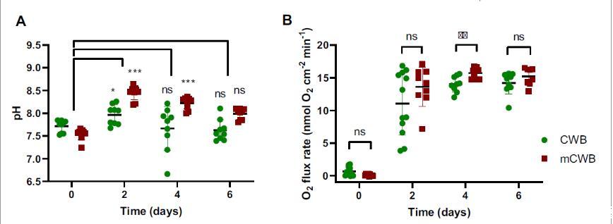圖2、未經處理模型隨時間變化的pH值和氧通量率。圖A中顯示了所有pH深度剖面(n=9)的單個值、平均值和標準偏差。圖B中顯示了氧氣通量速率(n=9)的單個值、平均值和標準偏差。pH值的變化使用Kruskal-Wallis檢驗和Dunn多重比較進行測試,包括Dunn校正,以觀察每個模型的pH值隨時間的顯著變化。將第0天的數據與第2、4和6天的數據進行比較。對于O2通量,使用雙尾Mann–Whitney U檢驗進行非參數分析,進行配對比較以確定兩個模型之間的顯著差異。