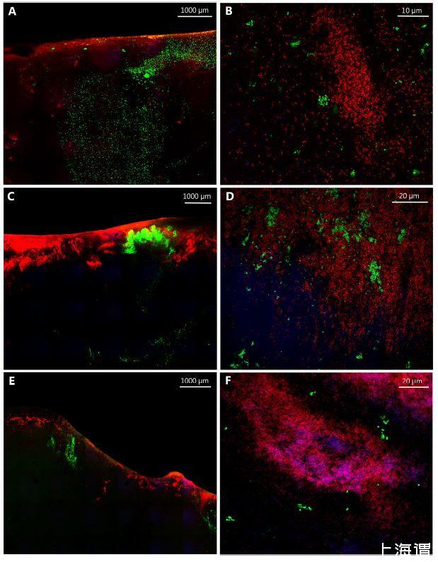 圖5、第2天(A)、第4天(C)和第6天(E)的mCWB概述。所有天均觀察到金黃色葡萄球菌和銅綠假單胞菌的小菌落:第2天(B)、第4天(D)和第6天(F)。金黃色葡萄球菌=綠色,銅綠假單胞菌=紅色,死細菌=藍色。