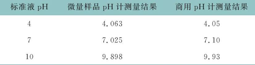為了檢驗(yàn)微量樣品pH計(jì)測(cè)量樣品pH是否準(zhǔn)確,用商用pH計(jì)與該微量樣品pH計(jì)同時(shí)測(cè)量pH分別為4、7、10的標(biāo)準(zhǔn)液并進(jìn)行對(duì)比,結(jié)果如表1所示。