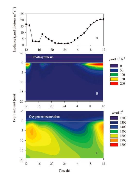 基于測量的起始剖面模擬24小時(shí)內(nèi)的氧氣動(dòng)力學(xué)。(A)用于模擬的測量輻照度。(B)微生物mat中模擬的總光合產(chǎn)氧量和(C)氧動(dòng)力學(xué)。單位為mmol L-1 h-1表示光合作用,mmol L-1表示濃度。模擬的前12h對應(yīng)圖。白線表示微生物藻墊-水界面。