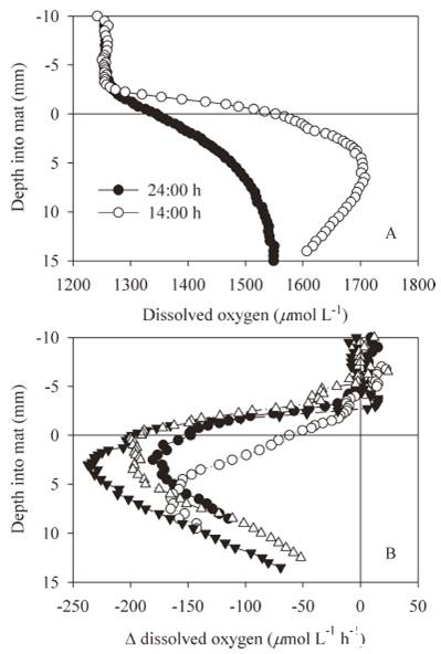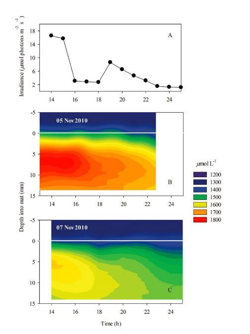 (A)Hoare湖近中午至午夜兩個(gè)時(shí)間序列中微生物墊中溶解氧濃度(mmolL-1)的輻照度(B,C)等值線圖。微生物藻墊-水界面處用白線表示