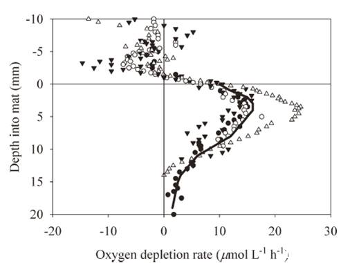 (A)氧通量與時(shí)間的關(guān)系;(B)輻照度與氧通量的關(guān)系。來自6個(gè)時(shí)間序列的數(shù)據(jù)被組合在一起,每個(gè)數(shù)據(jù)集使用不同的符號表示。