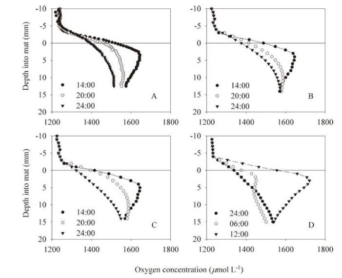 Hoare湖10米高氧動(dòng)力學(xué)模擬。(A)6h觀測數(shù)據(jù)。(B)模擬擴(kuò)散對起始剖面的影響。(C)完整模式,包括呼吸和光合作用。(D)利用環(huán)境輻照度數(shù)據(jù),模擬由午夜觀測值所得的氧氣分布圖??梢钥吹矫姘逯g12:00 h曲線的細(xì)微差異,因?yàn)橛^測是在0.25 mm深度增量時(shí)進(jìn)行的,而模型是在1 mm增量時(shí)運(yùn)行的。