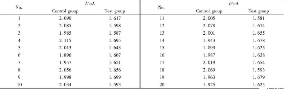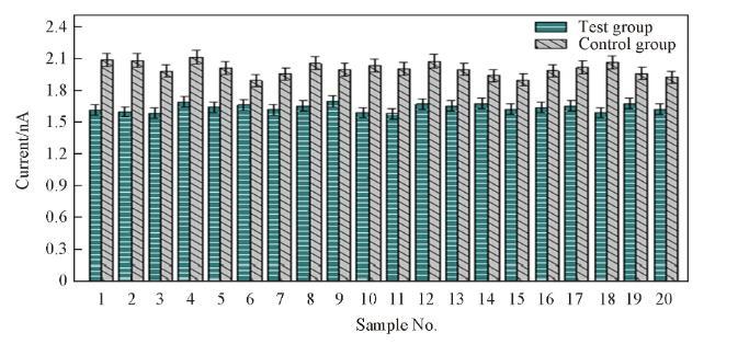 分別設置對照組和實驗組,對照組為正常光照環境下的蘆薈植株,實驗組為在黑暗環境下放置2 d的蘆薈植株(與對照組所用植株相同)。將納米金修飾后的CFME與參比電極插入蘆薈葉片的儲水凝膠組織中,進行電化學檢測,在不同葉片位置平行檢測20次,表1列出了測定結果。圖11為對照組和實驗組分別進行20次電化學響應實驗的柱狀圖,可以看出對照組的電化學響應均明顯高于實驗組(P<0.01),對照組和實驗組的氧化峰電流值具有統計學差異,說明無光條件下蘆薈多糖的含量比正常光照環境下明顯降低,可用于衡量蘆薈植株光合作用程度。