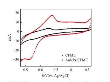 將CFME和Ag/AgCl參比電極置于納米金溶膠中,恒定電壓下電沉積適當時間。經AuNPs修飾后的CFME在pH=7.0的PBS緩沖溶液中,蘆薈多糖的循環伏安曲線的氧化峰電流值明顯增大(見圖6)。