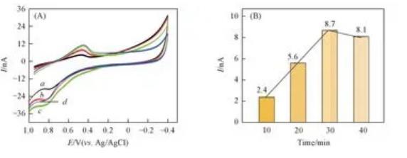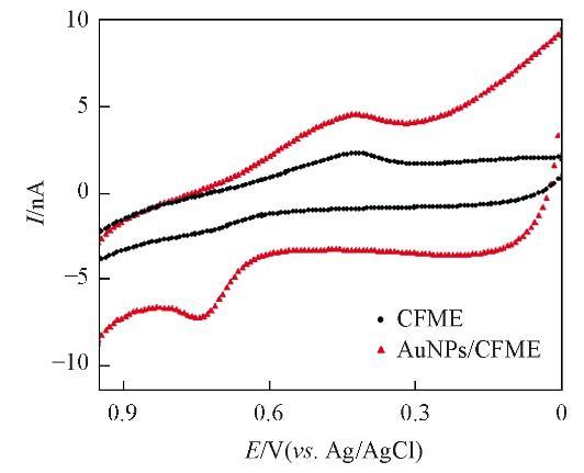 式中:A(cm2)為工作電極的有效電活性表面積;n為反應中的電子轉移,該值等于2;D為在確定的溶液中指探針分子的擴散系數,約為9.145×10-7cm2/s;υ(V/s)表示掃描速率,c(mol/L)對應于氧化還原探針的濃度,在該反應中檢測到的分子濃度為10μmol/L;Ip(nA)代表氧化還原電流峰值。由Ip對v1/2線性方程[圖9(B)]的斜率計算得出CFME和AuNPs/CFME的表面積分別為4.123×10-7和5.498×10-6cm2,AuNPs/CFME的微觀電活性面積是裸CFME的13.334倍。上述結果表明,與CFME相比,AuNPs/CFME具有更大的比表面積,從而可提供更多的電化學活性位點。綜上,AuNPs/CFME電化學性能提高是修飾電極大的比表面積、優良電導率以及AuNPs粒子的催化活性共同作用的結果。