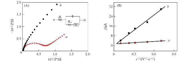 采用電化學阻抗譜(EIS)對修飾過程中電極的阻抗值變化進行了考察。在EIS譜測定過程中,以[Fe(CN)6]3-/[Fe(CN)6]4-作氧化還原探針,阻抗譜半圓直徑等于電子轉移電阻Ret.結果如圖9(A)所示,譜線a和b分別為CFME和AuNPs/CFME的EIS譜線,頻率范圍0.05 Hz——100 kHz.裸CFME的Ret值非常大,約為5.913×105Ω,而AuNPs/CFME的Ret值明顯減小,約為10-3Ω.這是由于納米金粒子的表面效應及表面原子的空位效應使納米金粒子具有高活性,修飾電極表面被一層納米金粒子覆蓋,降低了電極的界面阻抗值。電極的電活性區域是評估電極性能的重要參數,以多巴胺為氧化還原探針通過循環伏安法測定了修飾電極的有效表面積。對于可逆過程,采用Randles-Sevcik方程計算電極的電活性面積: