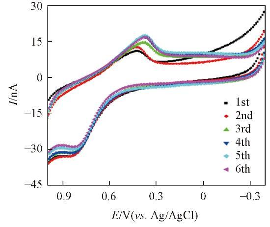 將AuNPs/CFME電極應用于蘆薈植株在體檢測,由圖7可見,CFME經納米金修飾后在蘆薈儲水凝膠組織中檢測蘆薈多糖的電化學穩定性明顯增強,通過比較6次循環伏安掃描曲線中氧化峰和還原峰電流的變化得出其相對標準偏差(RSD)值<10%.這說明CFME經納米金修飾后,降低了電化學動態監測蘆薈多糖水平的干擾。