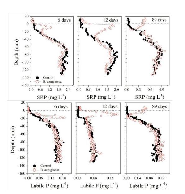 圖3、孵育后第6、12和89天,福壽螺生物擾動對沉積物中SRP和不穩定P濃度的影響。