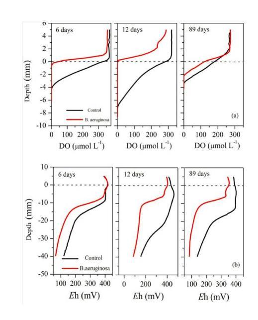 圖1、a)對照福壽螺處理中的沉積物中溶氧濃度及分布。b對照和福壽螺處理的沉積物中的Eh剖面濃度。零點虛線表示沉積物-水界面(SWI)(使用均質沉積物)。