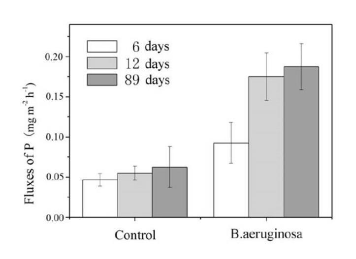 圖2、孵育后第6天,第12天和第89天測得的SWI上的P通量(從堆芯中的三部分上覆水中收集2 ml上覆水樣品,以1 h的頻率間隔,連續5 h,以計算P通量)。正值表示磷從沉積物中釋放到上層水,反之亦然。