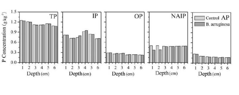 圖4、在有和沒有生物擾動的情況下,上部6 cm沉積物中的P分餾。TP,IP,OP,AP和NAIP分別代表總P,無機P,有機P,自生P和非磷灰石無機P。