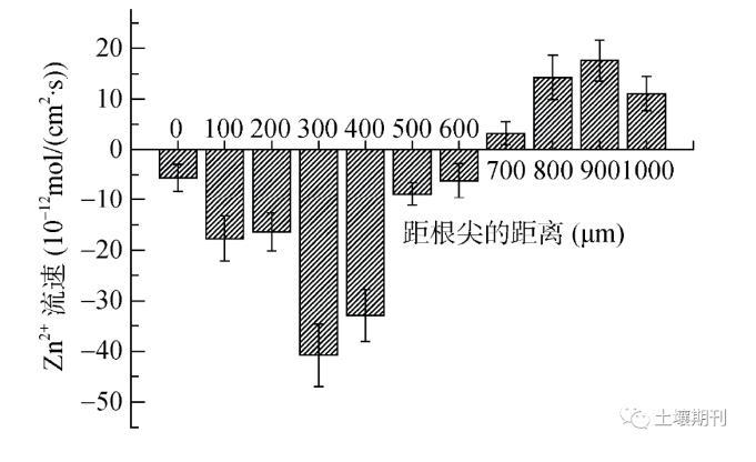 在對Zn2+微電極進行一系列優(yōu)化和表征后,通過搭載非損傷微測系統(tǒng)對Zn/Cd超積累植物伴礦景天幼苗根際不同微區(qū)Zn2+離子流進行了測定。如圖4所示,伴礦景天在距離根尖600μm內(nèi)Zn2+凈通量為內(nèi)吸,且在300μm處有最強的吸收速率,在700~1 000μm處則有明顯的Zn2+外排信號。伴礦景天作為一種Cd/Zn超積累植物,其對高濃度的重金屬表現(xiàn)出一定的抗性和耐受性。通過非損傷微測技術發(fā)現(xiàn)其在根尖微區(qū)存在外排Zn2+的部位,這可能是其避免高濃度重金屬對其根部造成損害的一種主動防御措施,但是這種植物主動外排金屬離子的分子生物學過程機制目前尚不完全清楚,值得深入分析和研究。