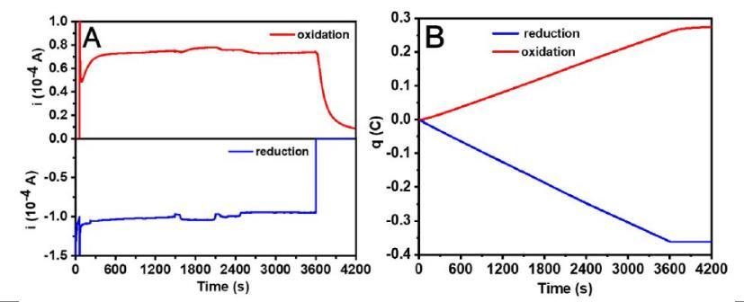 圖2、(A)集電極的電流-時間曲線(上)和發電機的電流-時間曲線(下)。(B)CG電池的充電時間曲線。紅線代表通過發生器的電荷,藍線代表通過集電極的電荷。