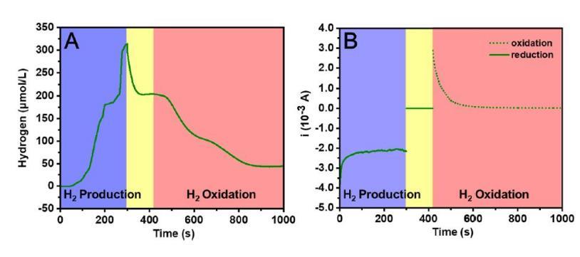 圖3、(A)氫氣微傳感器測量的H2濃度。(B)CG電池的發生器(實線)和集電極(虛線)相應的電流-時間曲線。