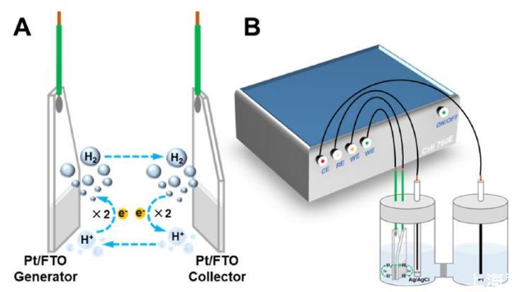 圖1、(A)集電極-發電機(CG)電池原理圖;(B)組裝在H型玻璃電解池中的三電極系統。