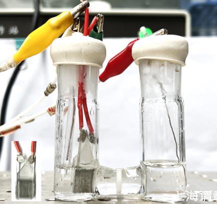 圖5、由Pt/FTO電極和在h型玻璃電解池中組裝的三電極系統組成的C-G電池的照片。