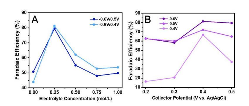圖4、CG電池的總法拉第效率與(A)電解質濃度和(B)pH 4.56的0.1 M醋酸鹽緩沖液中集電極電位的關系。