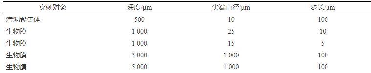 在使用微電極進行穿刺時,需要對生物膜的厚度進行預(yù)估,選擇適當尖端直徑的微電極及微電極移動的步長值,如表1所示,隨著穿刺深度的增大,微電極尖端直徑也隨之增大,較大的穿刺深度也可以選擇小尖端直徑的微電極。微電極移動步長值的選擇也應(yīng)與微電極尖端直徑相近或大于微電極尖端直徑為宜。
