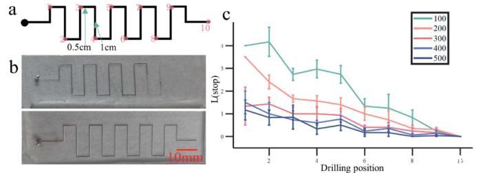 圖4。激光打孔位置實(shí)驗(yàn)過(guò)程及結(jié)果。(a)激光打孔位置編號(hào)示意圖;(b)2號(hào)位置(上圖)和10號(hào)位置(下圖)兩個(gè)不同鉆孔位置的液態(tài)金屬填充結(jié)果;(c)不同通道寬度下鉆孔位置和液態(tài)金屬充填結(jié)果統(tǒng)計(jì)結(jié)果;誤差條表示每個(gè)點(diǎn)的標(biāo)準(zhǔn)誤差;圖圖例表示不同通道寬度,單位為mm。