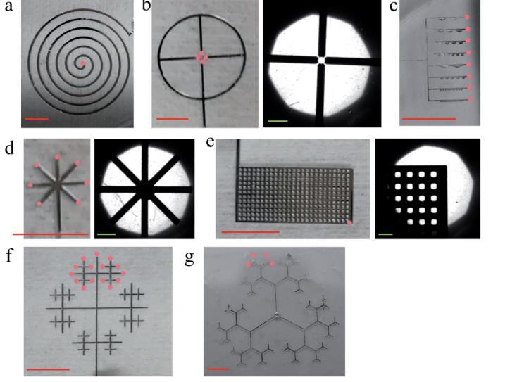圖5:一些復(fù)雜微電極的照片。紅點(diǎn)表示激光打孔在每個(gè)子圖中的位置。(a)圓形天線;(b)具有四通道末端的車輪設(shè)計(jì)及其詳細(xì)光學(xué)圖像;(c)細(xì)而小的八通道端結(jié)構(gòu)設(shè)計(jì);(d)多分岔設(shè)計(jì)及其詳細(xì)光學(xué)圖像;(e)大面積設(shè)計(jì)及其詳細(xì)光學(xué)圖像;(f)多分支、多終端的復(fù)雜渠道設(shè)計(jì);(g)多支細(xì)雪狀設(shè)計(jì)。紅色標(biāo)尺代表5mm,綠色標(biāo)尺代表500mm。