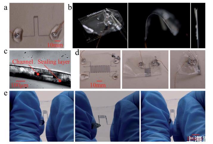 在目前的工作中,提出了一種制造高分辨率、薄(119毫米)和盲端液態(tài)金屬微電極的方法。微電極是通過(guò)向薄PDMS通道中注入室溫液態(tài)金屬制備的。用于塑造液態(tài)金屬的通道的高分辨率是通過(guò)光刻實(shí)現(xiàn)的。該薄電極結(jié)構(gòu)是在本實(shí)驗(yàn)室開(kāi)發(fā)的可逆PC膜鍵合工藝的輔助下開(kāi)發(fā)的。盡管已經(jīng)報(bào)道了幾種制造盲端液態(tài)金屬電極的方法,但整個(gè)通道的制造工藝和厚度都是有限的。在這方面,目前的工作涉及使用激光燒蝕技術(shù)在PDMS膜上制造小孔,使制造盲端液態(tài)金屬電極成為可能。所制造的薄液態(tài)金屬電極顯示出高度柔韌性,甚至可以承受數(shù)次折疊。此外,它具有很高的應(yīng)變承受能力,因此,它在開(kāi)發(fā)可穿戴傳感器和柔性電子產(chǎn)品方面的潛力在目前的工作中得到了說(shuō)明。
