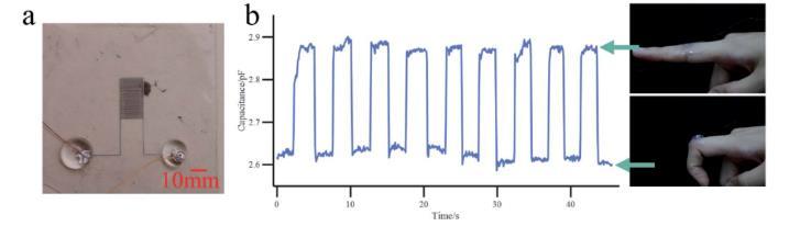 圖6。液態(tài)金屬基柔性微電極作為可穿戴應(yīng)變傳感器的應(yīng)用。(a)形狀傳感器的照片;(b)不同手指位置的測(cè)量電容。