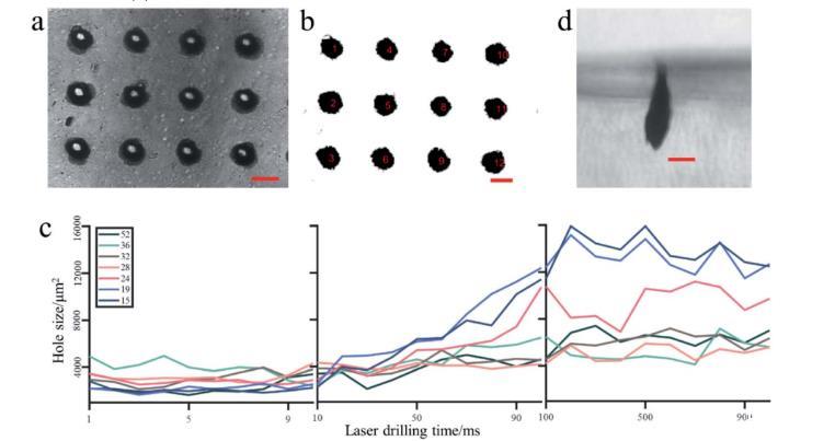 圖3 PDMS膜上不同激光打孔次數(shù)的實(shí)驗(yàn)結(jié)果及分析。(a)在顯微鏡下激光打孔的圖案照片;(b)抽取孔和編號(hào)孔;(c)不同鉆孔次數(shù)和膜厚度下激光鉆孔尺寸的統(tǒng)計(jì)結(jié)果;圖中圖例表示不同PDMS膜厚度,單位為mm;(d)顯微鏡下長(zhǎng)時(shí)間鉆孔的側(cè)視圖。(a)、(b)和(d)中的比例尺代表5毫米。