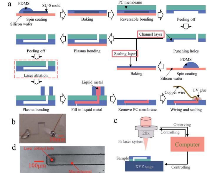 本研究報(bào)告了一種制備液態(tài)金屬圖案化薄膜的方法。通過(guò)使用這種方法,可以成功地將非常復(fù)雜的液態(tài)金屬電極集成到厚度低至119毫米的薄PDMS薄膜中。采用軟光刻技術(shù)實(shí)現(xiàn)了微電極通道的高分辨率。相對(duì)較薄的電極結(jié)構(gòu)是在我們之前報(bào)道的可逆PC膜鍵合技術(shù)的幫助下發(fā)展起來(lái)的。本工作采用飛秒激光打孔,在通道末端鉆出小孔,使液態(tài)金屬填充過(guò)程中空氣逸出,實(shí)現(xiàn)了盲端液態(tài)金屬電極結(jié)構(gòu)。本文介紹了微電極的制備工藝及關(guān)鍵工序。