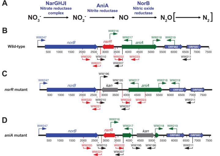 圖1、參與截短脫氮途徑的卡他莫拉菌基因產(chǎn)物示意圖及相關(guān)突變體的構(gòu)建。(A)卡他莫拉菌的截短脫氮途徑包括所示的前三個(gè)酶解步驟。卡他莫拉菌顯然缺乏將N2O還原為N2的能力(用括號(hào)表示)。(B至D)包含norB、nsrR和aniA基因的卡他莫拉菌染色體位點(diǎn)示意圖,(B)野生型O35E菌株、(C)O35E nsrR突變體和(D)O35E aniA突變體的側(cè)翼區(qū)域。箭頭表示用于PCR的不同引物的相對(duì)位置。