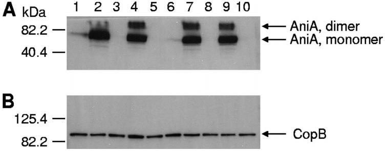 圖3、NsrR對(duì)野生型、突變型和互補(bǔ)突變型卡他莫拉菌AniA蛋白表達(dá)的影響。用多克隆AniA抗血清(A)或CopB特異性單克隆抗體10F3(B)作為一抗,對(duì)菌株的全細(xì)胞裂解液進(jìn)行Western印跡分析。泳道1,野生型菌株O35E;泳道2,O35E nsrR突變體;泳道3,O35E aniA突變體;泳道4,O35E nsrR(pWW115);泳道5,O35E nsrR(pWW150);第6道,野生型ETSU-9;第7道,ETSU-9 nsrR突變體;第8道,ETSU-9 aniA突變體;第9道,ETSU-9 nsrR(pWW115);第10道,ETSU-9 nsrR(pWW150)。推測的AniA單體和二聚體的位置用A組右側(cè)的箭頭表示。CopB外膜蛋白被用作載荷對(duì)照,其位置在B組右側(cè)用箭頭表示。分子質(zhì)量標(biāo)記物的位置在各圖的左側(cè)。