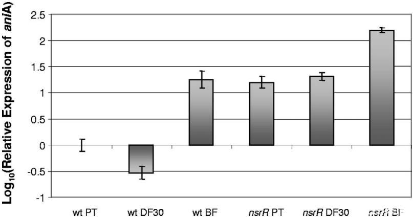 圖2通過qRTPCR測定卡他莫拉菌ETSU-9野生型和突變株在不同生長條件下aniA的表達(dá)。從野生型ETSU-9(wt)和ETSU-9 nsrR突變體(nsrR)細(xì)胞中分離出總RNA,這些細(xì)胞在含30μM Desferal(DF30)的肉湯和連續(xù)流生物膜系統(tǒng)(BF)中生長,在鐵限制條件下處于浮游狀態(tài)(PT)。qRTPCR如“材料與方法”中所述進(jìn)行。
