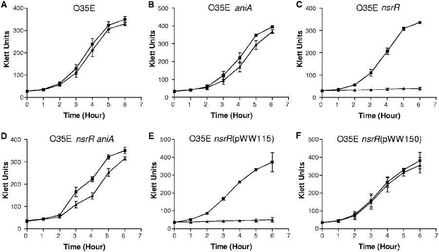 圖4、NO2-對(duì)卡他莫拉菌野生型、突變型和互補(bǔ)突變株生長的影響。野生型菌株O35E(A)、O35E aniA突變體(B)、O35E nsrR突變體(C)、O35E nsrR aniA突變體(D)、O35E nsrR(pWW115)(E)和O35E nsrR(pWW150)(F)的細(xì)胞在BHI培養(yǎng)基(黑正方形)或含5mM NaNO2的BHI培養(yǎng)基(黑三角形)中生長。大部分?jǐn)?shù)據(jù)為三個(gè)獨(dú)立生長實(shí)驗(yàn)的平均值;B組數(shù)據(jù)例外,為兩個(gè)獨(dú)立實(shí)驗(yàn)的平均值。