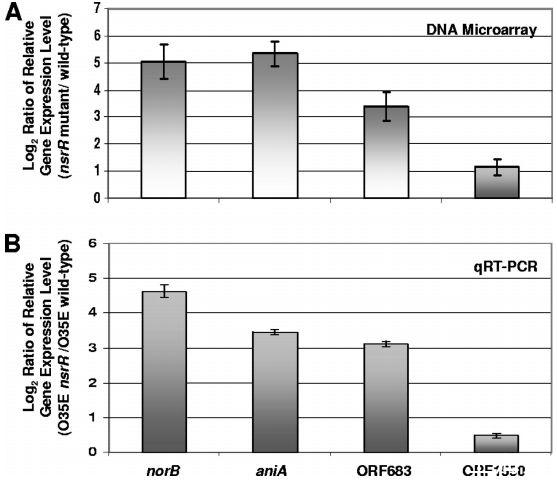 圖5、確定受NsrR調(diào)控的卡他莫拉菌基因。(A)按照材料與方法中的描述,對(duì)從野生型菌株O35E、7169和ETSU-9以及這些菌株的nsrR突變體中分離的總RNA進(jìn)行了DNA微陣列分析。圖中顯示了在所有三個(gè)nsrR突變體中持續(xù)上調(diào)至少兩倍(P<0.002)的基因數(shù)據(jù)。誤差條表示標(biāo)準(zhǔn)偏差。(B)qRT-PCR分析norB、aniA、MC ORF 683和MC ORF 1550在菌株O35E的nsrR突變體和野生型細(xì)胞中的相對(duì)表達(dá)水平。qRT-PCR測量的內(nèi)源對(duì)照是MC ORF 1234的表達(dá)。最大和最小相對(duì)表達(dá)水平用誤差條表示。