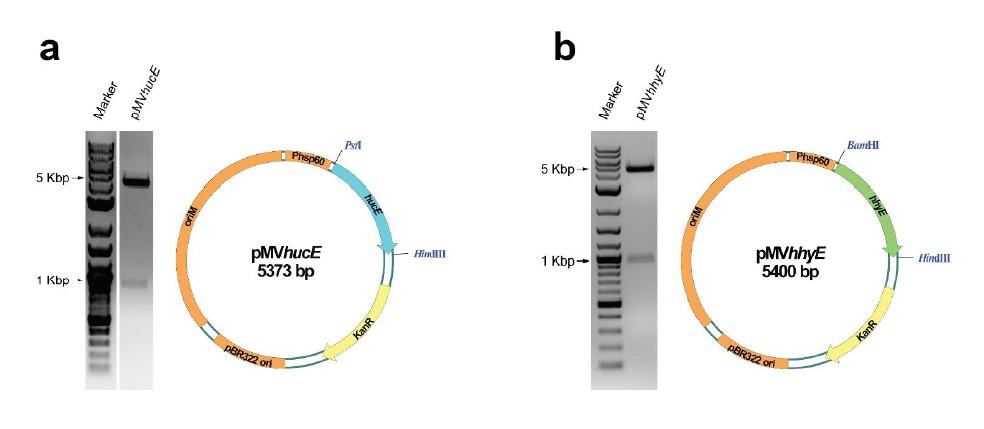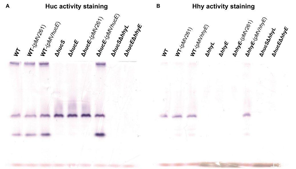 圖3、恥垢分枝桿菌野生型、衍生突變株和互補突變株中的氫化酶活性染色。全細胞裂解物用于在富含H 2的氣氛中以硝基藍四唑作為人工電子受體對H 2攝取進行酶譜染色。(A)野生型、ΔhucS、ΔhucE、ΔhucSΔhhyL、ΔhucEΔhhyE、以及互補的ΔhucE和野生型恥垢分枝桿菌(帶有空pMV261或互補載體pMV hucE)培養(yǎng)物的Huc活性染色)在早期穩(wěn)定期(OD max~3.0后24小時)收獲。(B)野生型、ΔhhyL、ΔhhyE、ΔhucSΔhhyL、ΔhucEΔhhyE和互補的ΔhhyE和野生型恥垢分枝桿菌(帶有空pMV261或互補載體pMV hhyE)培養(yǎng)物的Hhy活性染色)在中期穩(wěn)定期(OD max~3.0后72小時)收獲。