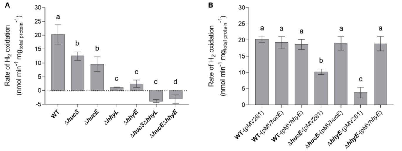圖2、恥垢分枝桿菌。野生型、衍生突變體和互補突變株的氫氧化。使用Unisense微呼吸H2電極通過電流分析法測量整個細胞在中期穩(wěn)定期(OD max~3.0后72小時)對H 2的吸收。(A)鐵硫蛋白野生型、單突變體和雙突變體(ΔhucE、ΔhhyE、ΔhucEΔhhyE)以及氫化酶結構亞基單突變體和雙突變體(ΔhhyE)之間H 2氧化速率的比較hucS,ΔhhyL,ΔhucSΔhhyL)。(B)分別用hucE和hhyE的表達補充的ΔhucE和ΔhhyE菌株中的H 2氧化速率。對照包括用空載體pMV261轉化的野生型、ΔhucE和ΔhhyE菌株以及用互補載體pMV hucE和pMV hhyE轉化的野生型菌株。
