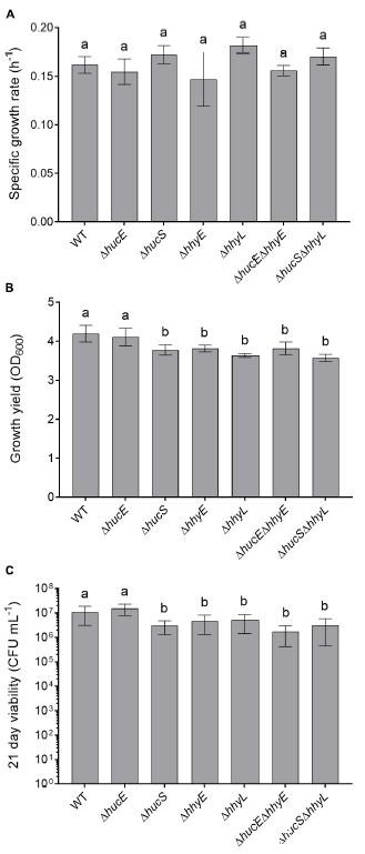 圖4、恥垢分枝桿菌。野生型和突變株的生長和存活率比較。七個菌株在補充有Tween80(LBT)的溶源肉湯中生長:鐵硫蛋白的野生型、單突變體和雙突變體(ΔhucE、ΔhhyE、ΔhucEΔhhyE),以及氫化酶結構亞基的單突變體和雙突變體ΔhucS,ΔhhyL,ΔhucSΔhhyL)。(A)指數(shù)期的特定生長率(μ)。(B)穩(wěn)定期后24小時的最終生長產量(OD max)。(C)穩(wěn)定期后21天的長期存活率(CFUmL–1)。